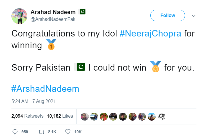 पाकिस्तान की तरफ से टोक्यो ओलंपिक की जेवलिन थ्रो प्रतियोगिता में चौथे स्थान पर आने वाले अरशद नदीम के नाम पर एक ट्विटर अकाउंट बनाकर नीरज चोपड़ा को अपना आदर्श बताकर उन्हें स्वर्ण पदक जीतने पर बधाई दी गई. साथ ही साथ उक्त पैरोडी हैंडल ने पाकिस्तान के लिए पदक ना जीत पाने का अफ़सोस भी जताया था.