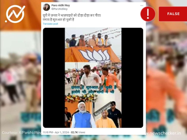सोशल मीडिया पर एक वीडियो को शेयर कर दावा किया गया कि उत्तर प्रदेश में आम लोगों ने भाजपाईयों को दौड़ा-दौड़ाकर पीटा। हमारी पड़ताल में यह दावा फर्जी साबित हुआ। फैक्ट चेक यहां पढ़ा जा सकता है।