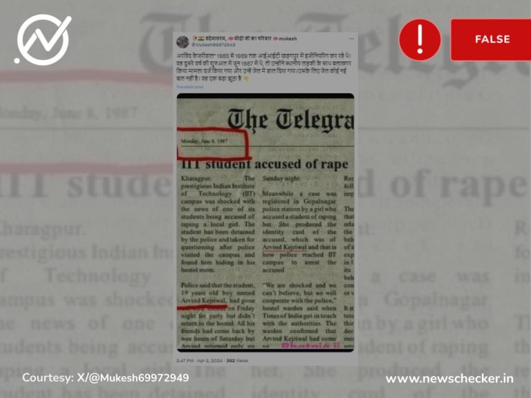 सोशल मीडिया पर एक पोस्ट को शेयर कर दावा किया गया कि आई.आई.टी. खड़गपुर में पढ़ाई के दौरान अरविंद केजरीवाल बलात्कार के आरोप में जेल गए थे। हमारी जांच में यह दावा फर्जी साबित हुआ। फैक्ट चेक यहां पढ़ा जा सकता है।