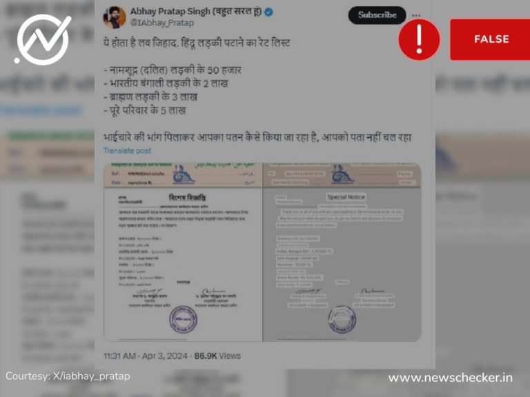 सोशल मीडिया पर एक पोस्ट को शेयर कर दावा किया गया कि बांग्लादेश के एक इस्लामिक संगठन ने हिंदू लड़कियों को प्रेमजाल में फंसाने के लिए मूल्य तय किए हैं। हमारी पड़ताल में यह दावा फर्जी साबित हुआ। फैक्ट चेक यहां पढ़ा जा सकता है।