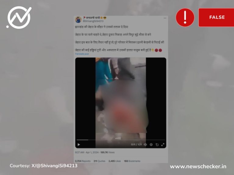 एक वीडियो को शेयर कर सोशल मीडिया यूजर्स ने दावा किया कि दूसरा निकाह नहीं करने पर झारखंड की जेहरा नामक महिला की उसके परिवार वालों ने बेरहमी से पिटाई कर दी। हमारी पड़ताल में यह दावा फर्जी साबित हुआ। फैक्ट चेक यहां पढ़ें।
