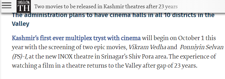 دی ہندو میڈیا ادارن چُھ اکسِ رپورٹس منز لیوکھمتُ زہِ “کشیر ہندسِ سرینگرس منز پننیِ نوعیتکُ گوڈنیوکُ ملٹی پلیکس سنیما ہال گژھِ 1 اکتوبر پیٹھ چالو۔ تہ ینہ زہہ فلمہ وکرم ویدھا تہ پونین سلیوان ہاونہ۔ تھیٹرس منز فلم وچھنکُ تجربہ ییہِ کرنہ کشیر منز 23 وہریو پتہ”۔