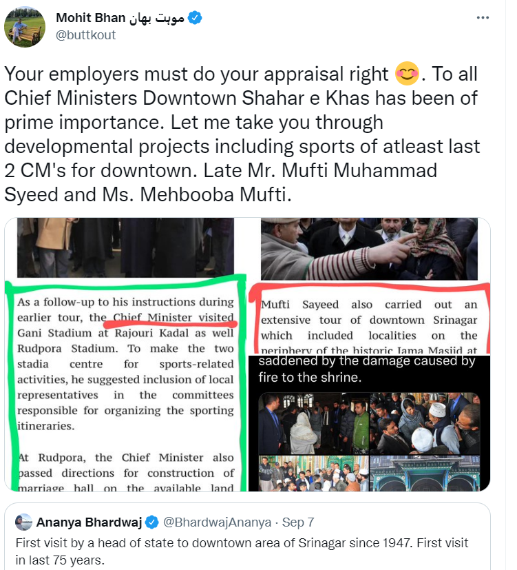 اتھ سلسلز منز یلہ اسہِ زانون ہیوت زہِ یہ دعویٰ کوتاہ وائرل چُھ، اسہِ کرِ کینہ کیورڈ ‘گورنر سندُ ڈاون ٹاون دورء’ ٹویٹرس پیٹھ سرچ۔ اسہِ لوبہ سینئر صحافی اننیہ بھارتواج سندُ اکھ ٹویٹ یتھ منز فوٹوؤ سان یہوئ دعویٰ چُھ آمت کرنہ منوج سہنا چھِ جموں و کشنیر ہندِ گوڈنیکِ زیٹھِ یمو ڈاون ٹاون سرینگرکُ دورء کور۔
