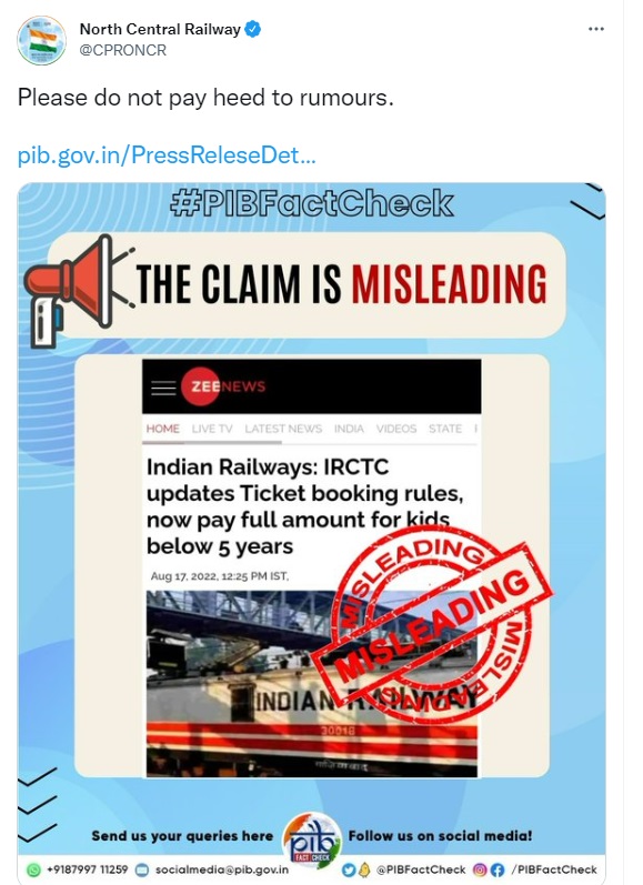 سرکاری سکیمن تہ پالسین متعلق غلط معلومات خآطرء بناونہ آمژ پی آئی بی فیکٹ چیکن چُھ یم نیوز رپورٹ غلط قرار دیتِہ مئتِ۔ تمو چُھ وونمتُ زہِ پانژ وَہّرِبچن اَتھ صورتس منز کرایہ دیِنِ اگربچس خاطرء آسہ ٹرین سیٹ بُک آمژ کرنہ۔ نت چُھہ پانژء وَہّرِ بچن خاطرء ٹرین منز مفت سفر۔