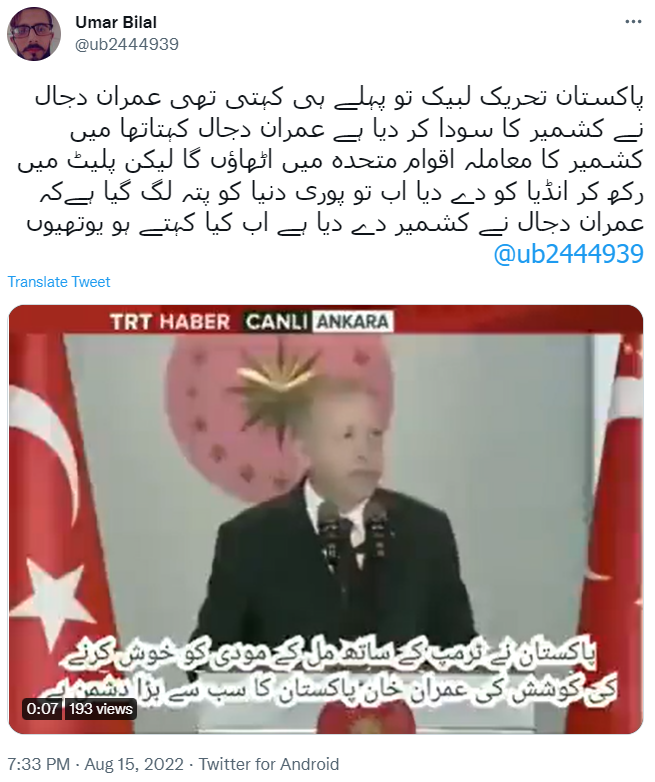 ویڈیو سآتِ دینہ آمتِ معلومات مطابق چھُ ترکی ہند صدر رجب طیب اردوغانن اَتّھ بیانس منز ونمت زہِ “اسہ چھِ کشیر ہندین حالاتن پیٹھ نظر تھایتھ۔ میہ کئرِ پاکستان کسِ وزیراعظم عمران خانس سآتِ تازء حالاتن پیٹھ کتھ”۔ امہ سآتِ آو سمجھ زہِ یہ بیان چُھ پرون۔ تہ یہ چُھ یوان غلط معلومات سان شِیئر کرنہ۔