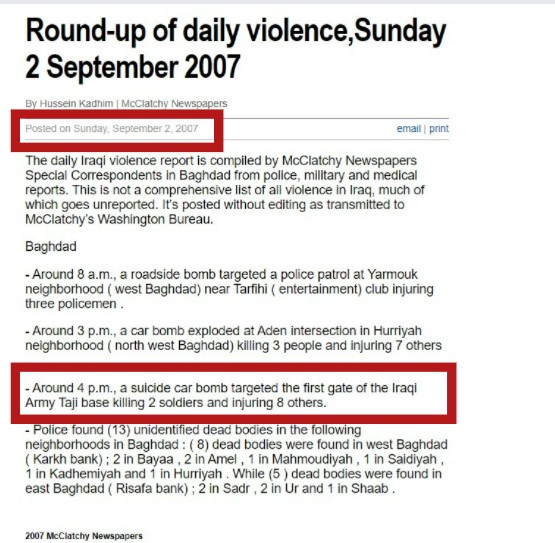 امہ علاؤ آؤ اسہِ یہ ویڈیو لبنہ 2 ستمبر 2007 تس منز شائع میک کلیچی اخبار چہِ ویب سایٹِ پیٹھ لبنہ۔ تفصیلس منز اوس لکتھِ زہِ عراق فوجی اڈہ کسِ تاجی گیٹس پیٹھ کور شام 4 بجے نزدیک اکِ خودکش کاڑءِ بم دھماکہ یتھ منز 2 فوجی ہلاک تہ 8 زخمی سپندِ۔