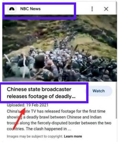 ಈ ಕುರಿತು “NBC News, Chinese broadcaster, deadly clash ಮತ್ತು February 19” ಎಂದು ಗೂಗಲ್ ಕೀವರ್ಡ್ ಸರ್ಚ್ ನಡೆಸಿದಾಗ, ಇದೇ ಹೆಡ್ಲೈನ್ ಅನ್ನು ನೀಡಲಾಗಿದೆ. ಆದರೆ ಈ ಸುದ್ದಿಯಲ್ಲಿನ ಥಂಬ್ನೈಲ್ ಫೋಟೋ ಮಾತ್ರ ಭಿನ್ನವಾಗಿದೆ. ವೈರಲ್ ಚಿತ್ರ ಮತ್ತು ಎನ್ಬಿಸಿ ಸುದ್ದಿವಾಹಿನಿಯ ಸ್ಕ್ರೀನ್ಗ್ರ್ಯಾಬ್ ನಡುವಿನ ವ್ಯತ್ಯಾಸವನ್ನು ಇಲ್ಲಿ ನೋಡಬಹುದು.