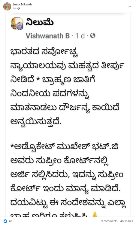ಈ ಪೋಸ್ಟ್ನಲ್ಲಿ “ಭಾರತದ ಸರ್ವೋಚ್ಚ ನ್ಯಾಯಾಲಯವು ಮಹತ್ವ ತೀರ್ಪು ನೀಡಿದೆ. ಬ್ರಾಹ್ಮಣ ಜಾತಿಗೆ ನಿಂದನೀಯ ಪದಗಳನ್ನು ಮಾತನಾಡಲು ದೌರ್ಜನ್ಯ ಕಾಯ್ದೆ ಅನ್ವಯಿಸುತ್ತದೆ. ಅಡ್ವೊಕೇಟ್ ಮುಖೇಶ್ ಭಟ್ ಜಿ. ಅವರು ಸುಪ್ರೀಂ ಕೋರ್ಟ್ಗೆ ಅರ್ಜಿ ಸಲ್ಲಿಸಿದ್ದು, ಅದನ್ನು ಕೋರ್ಟ್ ಮಾನ್ಯ ಮಾಡಿದೆ. ಈ ಸಂದೇಶವನ್ನು ಎಲ್ಲ ಬ್ರಾಹ್ಮಣರಿಗೂ ಕಳುಹಿಸಿ” ಎಂದು ಪೋಸ್ಟ್ನಲ್ಲಿ ಹೇಳಲಾಗಿದೆ.