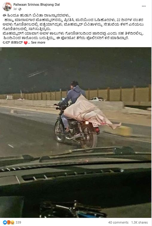 ಫೇಸ್ಬುಕ್ ನಲ್ಲಿ ಕಂಡು ಬಂದ ಈ ಕ್ಲೇಮಿನಲ್ಲಿ, “ಈ ಹಿಂದೂ ಹುಡುಗಿ ಬಿನಿತಾ ರಾಜಸ್ಥಾನದವಳು, ಹಣ್ಣು ಮಾರಾಟಗಾರ ಮೊಹಮ್ಮದ್ನನ್ನು ಪ್ರೀತಿಸಿ, ಮನೆಯಿಂದ ಓಡಿಹೋದಳು, 22 ದಿನಗಳ ನಂತರ ಅವಳು ಗೋಣಿಚೀಲದಲ್ಲಿ ಪತ್ತೆಯಾಗಿದ್ದಳು, ಮೊಹಮ್ಮದ್ ಬಿನಿತಾಳನ್ನು ಸೇತುವೆಯ ಕೆಳಗೆ ಎಸೆಯಲು ಗೋಣಿಚೀಲದಲ್ಲಿ ಸಾಗಿಸುತ್ತಿದ್ದನು. ಮೊಹಮ್ಮದ್ಗೆ ಯಾವಾಗ ಅವಳ ಕಾಲುಗಳು ಗೋಣಿಚೀಲದಿಂದ ಜಾರಿದವು ಎಂದು ಸಹ ತಿಳಿದಿರಲಿಲ್ಲ. ಹಿಂದಿನಿಂದ ಕಾರೊಂದು ಬರುತ್ತಿದ್ದು, ಈ ಫೋಟೋ ತೆಗೆದು ಪೊಲೀಸರಿಗೆ ಕರೆ ಮಾಡಿದ್ದಾರೆ. ಲವ್ ಜಿಹಾದ್” ಎಂದಿದೆ.