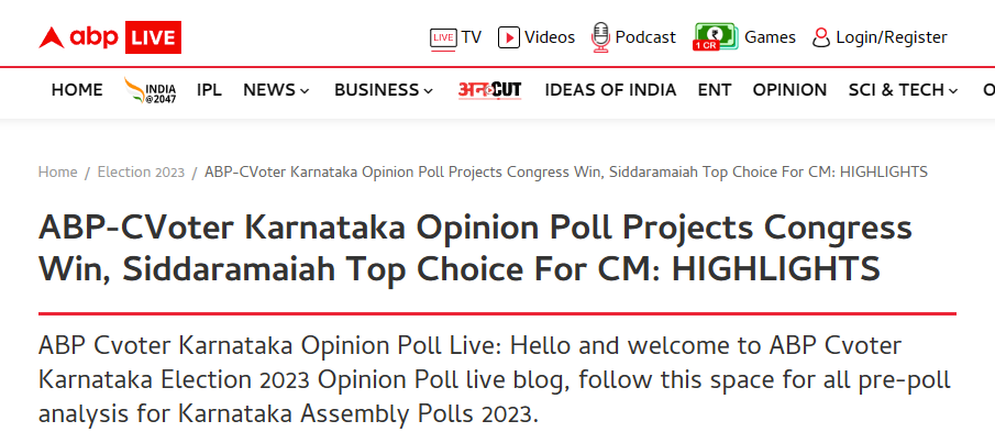 ಮಾರ್ಚ್ 29, 2023ರಂದು ಎಬಿಪಿ ಲೈವ್ ವರದಿಯ ಪ್ರಕಾರ, “ಎಬಿಪಿ-ಸಿಓಟರ್ ಕರ್ನಾಟಕ ಸಮೀಕ್ಷೆ ಕಾಂಗ್ರೆಸ್ ಗೆಲುವು ಮತ್ತು ಸಿದ್ದರಾಮಯ್ಯ ಅವರನ್ನು ಜನ, ಸಿಎಂ ಸ್ಥಾನಕ್ಕೆ ಉನ್ನತ ಆಯ್ಕೆಯಾಗಿ ಪರಿಗಣಿಸುತ್ತಿರುವುದಾಗಿ ಹೇಳಿದೆ. ಈ ಸುದ್ದಿಯಲ್ಲಿ ಒಟ್ಟು 224 ವಿಧಾನಸಭೆ ಸ್ಥಾನಗಳ ಪೈಕೆ ಕಾಂಗ್ರೆಸ್ 115-127 ಸ್ಥಾನ, ಬಿಜೆಪಿ 68-80 ಸ್ಥಾನ, ಜೆಡಿಎಸ್ 23-35 ಸ್ಥಾನ, ಇತರರು 0-2 ಸ್ಥಾನ ಪಡೆಯುವುದಾಗಿ ಹೇಳಲಾಗಿದೆ.