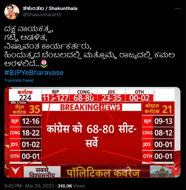 ಟ್ವಿಟರ್ ನಲ್ಲಿ ಕಂಡುಬಂದ ಈ ಕ್ಲೇಮ್ ಹೀಗಿದೆ “ದಕ್ಷ ನಾಯಕತ್ವ, ಗಟ್ಟಿ ಆಡಳಿತ, ನಿಷ್ಠಾವಂತ ಕಾರ್ಯಕರ್ತರು, ಹಿಂದುತ್ವದ ಬೆಂಬಲದಲ್ಲಿ ಮತ್ತೊಮ್ಮೆ ರಾಜ್ಯದಲ್ಲಿ ಕಮಲ ಅರಳಲಿದೆ.” ಎಂದು ಹೇಳಲಾಗಿದ್ದು, ಇದರೊಂದಿಗೆ ಲಗತ್ತಿಸಲಾದ ಚಿತ್ರದಲ್ಲಿ ಬಿಜೆಪಿಗೆ 115-127 ಸ್ಥಾನ, ಕಾಂಗ್ರೆಸ್ಗೆ 68-90 ಸ್ಥಾನ, ಜೆಡಿಎಸ್ಗೆ 23-25 ಸ್ಥಾನ, ಇತರರಿಗೆ 0-2 ಸ್ಥಾನ ಎಂದು ಹೇಳಲಾಗಿದೆ. ಈ ಟ್ವೀಟ್ ಅನ್ನು ಇಲ್ಲಿ ನೋಡಬಹುದು.