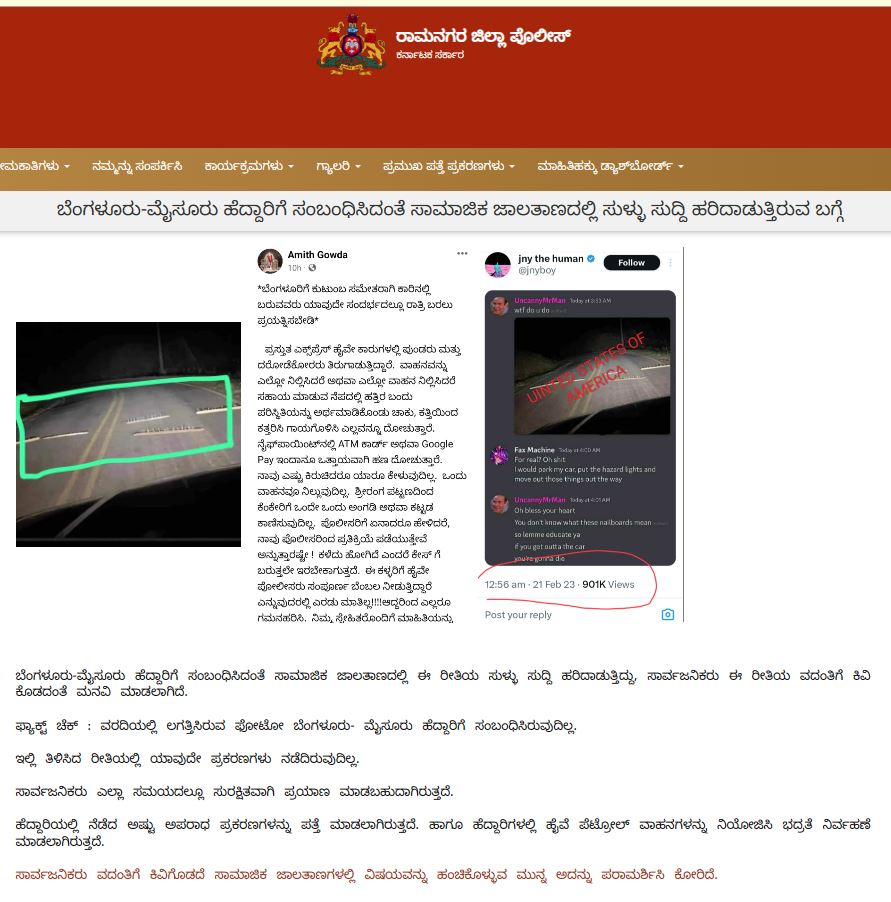 ಇದರೊಂದಿಗೆ ಬೆಂಗಳೂರು-ಮೈಸೂರು ಹೆದ್ದಾರಿಗೆ ಸಂಬಂಧಿಸಿದಂತೆ ಸಾಮಾಜಿಕ ಜಾಲತಾಣದಲ್ಲಿ ಸುಳ್ಳು ಸುದ್ದಿ ಹರಿದಾಡುತ್ತಿರುವ ಬಗ್ಗೆ ರಾಮನಗರ ಪೊಲೀಸ್ ವರಿಷ್ಠಾಧಿಕಾರಿಯವರು ಟ್ವೀಟ್ ಮಾಡಿದ್ದಾರೆ. ಜೊತೆಗೆ ಜಿಲ್ಲಾ ಪೊಲೀಸ್ ವೆಬ್ನಲ್ಲಿ ಇದು ಸುಳ್ಳು, ಪ್ರಯಾಣಿಕರು ಗಾಬರಿ ಪಡುವ ಅಗತ್ಯವಿಲ್ಲ ಎಂದು ಹೇಳಲಾಗಿದೆ.