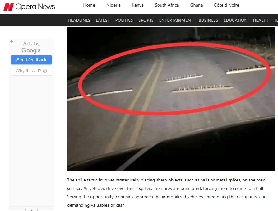 ಇದರೊಂದಿಗೆ ದಕ್ಷಿಣ ಆಫ್ರಿಕಾದ ಒಪೆರಾ ನ್ಯೂಸ್, ಆಗಸ್ಟ್ 5, 2023ರಂದು ವರದಿಯೊಂದನ್ನು ಪ್ರಕಟಿಸಿದ್ದು, ಅದರಲ್ಲಿ “ದಕ್ಷಿಣ ಪ್ರಿಟೋರಿಯಾದ ಸೌಟ್ಪಾನ್ ರಸ್ತೆಯಲ್ಲಿ ಡಕಾಯಿತರು ರಸ್ತೆಗಳಲ್ಲಿ ಮೊಳೆಗಳನ್ನು ಹಾಕಿರುವ ಪ್ರಕರಣಗಳಿದ್ದು, ಎಚ್ಚರಿಕೆಯಂತೆ ಹೋಗುವಂತೆ ಚಾಲಕರು ಒತ್ತಾಯಿಸಿದ್ದಾರೆ” ಎಂದಿದೆ. ಈ ವರದಿಯಲ್ಲಿ ಲಗತ್ತಿಸಲಾಗಿರುವ ಫೋಟೋ ವೈರಲ್ ಪೋಸ್ಟ್ ನಲ್ಲಿರು ಫೋಟೋಕ್ಕೆ ಸಾಮ್ಯತೆಯನ್ನು ಹೊಂದಿದೆ.