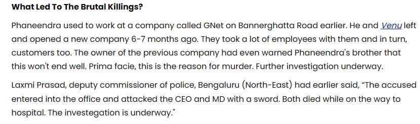 ಜುಲೈ 12, 2023ರ ಮಿರರ್ ನೌ ವರದಿ ಪ್ರಕಾರ, “ಬೆಂಗಳೂರಿನ ಏರೋನಿಕ್ಸ್ ಇಂಟರ್ನೆಟ್ ಕಂಪೆನಿಯ ಆಡಳಿತ ನಿರ್ದೇಶಕ, ಮುಖ್ಯ ಕಾರ್ಯನಿರ್ವಣಾಧಿಕಾರಿ ಫಣೀಂದ್ರ ಸುಬ್ರಹ್ಮಣ್ಯ ಮತ್ತು ವಿನು ಕುಮಾರ್ ಎಂಬವರ ಹತ್ಯೆಯಾಗಿದ್ದು, ಅಮೃತಹಳ್ಳಿ ಪೊಲೀಸರು ಮೂವರು ಆರೋಪಿಗಳನ್ನು ಬಂಧಿಸಿದ್ದಾರೆ” ಎಂದಿದೆ. ಹಾಡುಹಗಲೇ ನಗರದಲ್ಲಿ ಈ ಹತ್ಯೆ ನಡೆದಿದ್ದು, ಇದಕ್ಕೆ ಕಾರಣವಾಗಿರಬಹುದಾದ ಅಂಶಗಳನ್ನು ಇದೇ ವರದಿಯಲ್ಲಿ ನೀಡಲಾಗಿದೆ. “ಫಣೀಂದ್ರ ಅವರು ಜಿ ನೆಟ್ ಹೆಸರಿನ ಕಂಪೆನಿಯೊಂದಕ್ಕೆ ಕೆಲಸ ಮಾಡುತ್ತಿದ್ದು 6-7 ತಿಂಗಳ ಹಿಂದೆ ಹೊಸ ಕಂಪೆನಿ ತೆರೆದಿದ್ದರು. ಜೊತೆಗೆ ತಮ್ಮ ಹಳೆಯ ಕಂಪೆನಿಯಿಂದ ಅನೇಕ ಸಿಬ್ಬಂದಿ ಮತ್ತು ಗ್ರಾಹಕರನ್ನು ಪಡೆದಿದ್ದರು. ಇದಕ್ಕಾಗಿ ಹಿಂದಿನ ಕಂಪೆನಿ ಮಾಲಕರು ಫಣೀಂದ್ರ ಅವರ ಸಹೋದರನಿಗೆ ಇದು ಚೆನ್ನಾಗಿರಲ್ಲ ಎಂದು ಬೆದರಿಸಿದ್ದರು ಎಂದು ಪ್ರಾಥಮಿಕ ತನಿಖೆಯಲ್ಲಿ ಗೊತ್ತಾಗಿದೆ” ಎಂದಿದೆ.