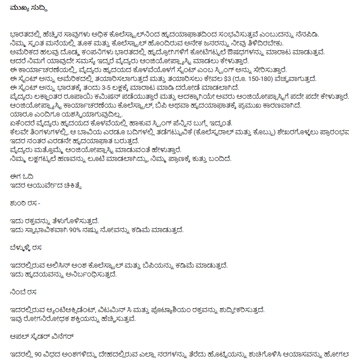 ಹೃದಯದ ನಾಳದ ಬ್ಲಾಕೇಜ್ ಸಮಸ್ಯೆಗೆ ಮನೆ ಮದ್ದು, ಆಯುರ್ವೇದ ಔಷಧ ಪರಿಣಾಮಕಾರಿ ಎಂಬಂತೆ ಸಾಮಾಜಿಕ ಜಾಲತಾಣದಲ್ಲಿ ಸುದ್ದಿಹರಿದಾಡುತ್ತಿದೆ.
