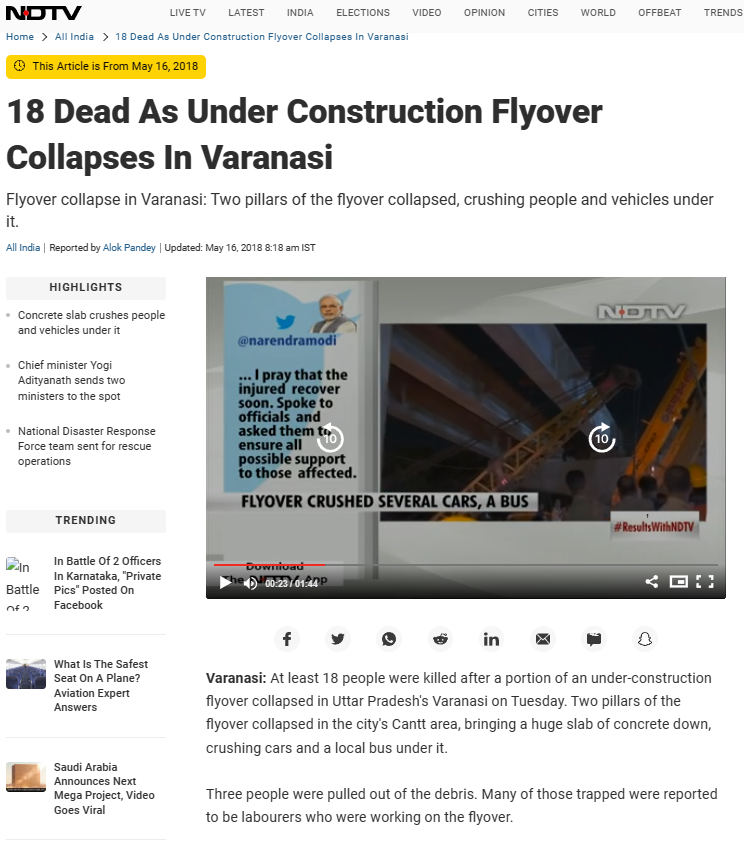 ಈ ಕುರಿತು ಮೇ 16, 2018ರ ಎನ್ಡಿಟಿವಿ ವರದಿ ಲಭ್ಯವಾಗಿದ್ದು, ಆ ವರ್ಷ ಮೇ 15ರಂದು ನಡೆದ ಘಟನೆಯಲ್ಲಿ 18 ಮಂದಿ ಮೃತಪಟ್ಟಿದ್ದಾರೆ ಎಂದು ಹೇಳಿದೆ. ವಾರಾಣಸಿಯಲ್ಲಿ ಇನ್ನೂ ನಿರ್ಮಾಣವಾಗದ ಫ್ಲೈ ಓವರ್ನ ಕಾಂಕ್ರೀಟ್ ತೊಲೆಯೊಂದು ಬಿದ್ದುಅದರಡಿಗೆ ವಾಹನಗಳು ಸಿಲುಕಿ ಅಪ್ಪಚ್ಚಿಯಾಗಿತ್ತು. ಈ ದುರ್ಘಟನೆ ವೇಳೆ ವಾಹನದಲ್ಲಿದ್ದವರು ಅಲ್ಲೇ ಮೃತಪಟ್ಟಿರುವುದಾಗಿ ಹೇಳಲಾಗಿದೆ. ನಗರ ಕಂಟೋನ್ಮೆಂಟ್ ಪ್ರದೇಶದಲ್ಲಿ ಈ ಘಟನೆ ನಡೆದಿದ್ದು, ಮೃತಪಟ್ಟವರಲ್ಲಿ ಹಲವರು ಫ್ಲೈ ಓವರ್ ಕೆಲಸಗಾರರು ಕೂಡ ಸೇರಿದ್ದಾರೆ ಎಂದು ಹೇಳಲಾಗಿದೆ. ನಾಲ್ಕು ಕಾರುಗಳು, ಒಂದು ಆಟೋ, ಒಂದು ಮಿನಿ ಬಸ್ ಕಾಂಕ್ರೀಟ್ ತೊಲೆಯ ಕೆಳಗೆ ಸಿಲುಕಿ ಅಪ್ಪಚ್ಚಿಯಾಗಿವೆ ಎಂದು ವರದಿ ಹೇಳಿದೆ.