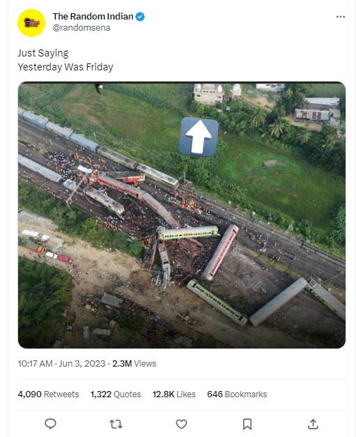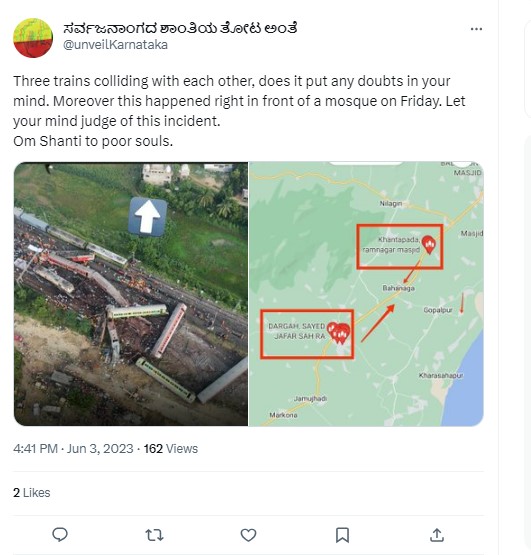 ಅಪಘಾತದ ಒಂದು ದಿನದ ನಂತರ, ಟ್ವಿಟರ್ ಬಳಕೆದಾರ @Randomsena ಅಪಘಾತದ ಸ್ಥಳದ ಪಕ್ಕದ ಕಟ್ಟಡವನ್ನು ತೋರಿಸುವ ವೈರಲ್ ಚಿತ್ರವನ್ನು ಹಂಚಿಕೊಂಡಿದ್ದಾರೆ. ಆ ಮೂಲಕ ಅಪಘಾತಕ್ಕೆ ನಿರ್ದಿಷ್ಟ ಸಮುದಾಯದ ಸಂಪರ್ಕವಿದೆ ಎಂದು ಬಣ್ಣಿಸಲು ಯತ್ನಿಸಿದ್ದಾರೆ. ಅನಂತರ ಈ ಟ್ವೀಟ್ ಡಿಲೀಟ್ ಮಾಡಿದ್ದು, ಆ ವೇಳೆಗೆ ಈ ಟ್ವೀಟ್ ಅನ್ನು 4,000 ಕ್ಕೂ ಹೆಚ್ಚು ಬಾರಿ ರಿಟ್ವೀಟ್ ಮಾಡಲಾಗಿದೆ. ಇತರ ಅನೇಕ ಸಾಮಾಜಿಕ ಮಾಧ್ಯಮ ಬಳಕೆದಾರರು ಶುಕ್ರವಾರದಂದು ಮಸೀದಿಯ ಬಳಿ ತ್ರಿವಳಿ ರೈಲು ಅಪಘಾತ ಸಂಭವಿಸಿದೆ ಎಂದು ಹೇಳಿ ಚಿತ್ರವನ್ನು ಹಂಚಿಕೊಂಡಿದ್ದಾರೆ.