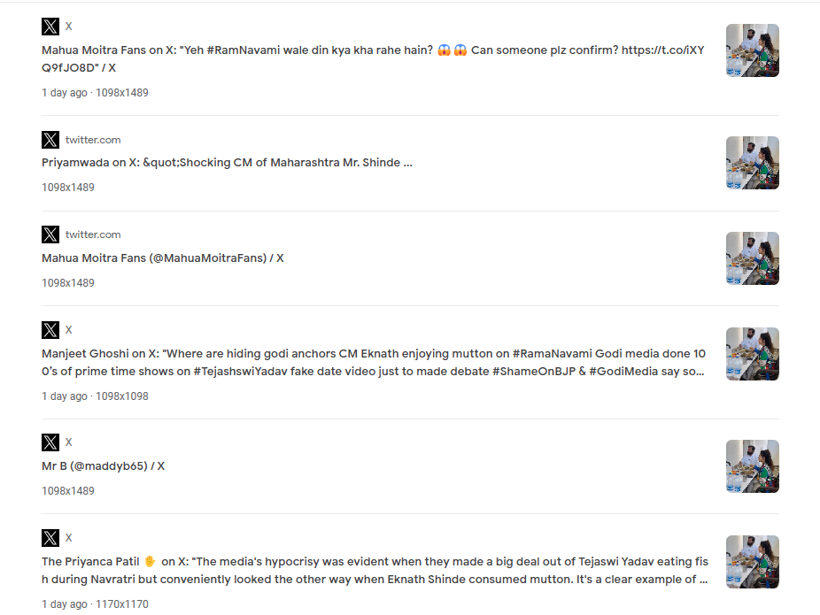 ಮುಖ್ಯಮಂತ್ರಿ ಏಕನಾಥ್ ಶಿಂಧೆ ಅವರು ರಾಮನವಮಿಯಂದು ಮಾಂಸ ಸೇವಿಸಿದ್ದಾರೆ ಎಂದು ಹೇಳಿದ್ದನ್ನು ಪರಿಶೀಲಿಸಲು ನಾವು ಮೊದಲು ಫೋಟೋವನ್ನು ಪರಿಶೀಲಿಸಿದ್ದೇವೆ. ಬ್ಲಾಗರ್ ಕಾಮಿಯಾ ಜಾನಿ ಅವರು ಮುಖ್ಯಮಂತ್ರಿಯೊಂದಿಗೆ ಕುಳಿತಿರುವುದನ್ನು ಗಮನಿಸಿದ್ದೇವೆ. ಏತನ್ಮಧ್ಯೆ, ಫೋಟೋದ ಮುಖ್ಯ ಮೂಲವನ್ನು ಕಂಡುಹಿಡಿಯಲು ನಿರ್ಧರಿಸಿ, ನಾವು ಸಂಬಂಧಿತ ಫೋಟೋವನ್ನು ಗೂಗಲ್ನಲ್ಲಿ ರಿವರ್ಸ್ ಸರ್ಚ್ ಮಾಡಿದ್ದೇವೆ. ಆದರೆ ಫೋಟೋದ ಮೂಲವನ್ನು ಕಂಡುಹಿಡಿಯಲು ಸಾಧ್ಯವಾಗಲಿಲ್ಲ. ಆದಾಗ್ಯೂ, ಅದೇ ಫೋಟೋವನ್ನು ಬಳಸಿಕೊಂಡು, ವಿವಿಧ ಭಾಷೆಗಳಲ್ಲಿ ಅನೇಕ ಬಳಕೆದಾರರು ಮಾಡಿದ ಹೇಳಿಕೆಗಳನ್ನು ನಾವು ನೋಡಿದ್ದೇವೆ.
