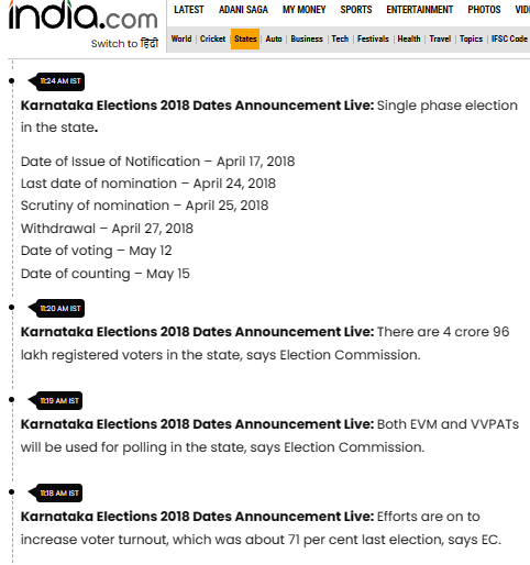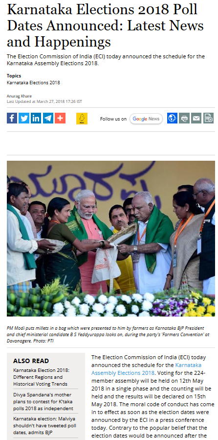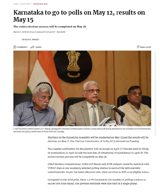 ಇಂಡಿಯಾ ಡಾಟ್ ಕಾಮ್ ಮಾರ್ಚ್ 27, 2018ರಂದು ಪ್ರಕಟಿಸಿದ ವರದಿಯಲ್ಲೂ ಇದೇ ದಿನಾಂಕಗಳನ್ನು ಚುನಾವಣಾ ಆಯೋಗ ಘೋಷಿಸಿದ್ದಾಗಿ ವರದಿಯಲ್ಲಿ ಹೇಳಿದೆ.