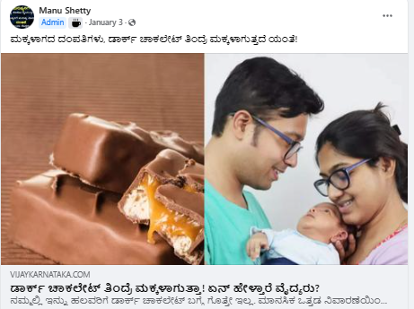ಈ ಕುರಿತ ಕ್ಲೇಮ್ ಹೀಗಿದೆ. “ಮಕ್ಕಳಾಗದ ದಂಪತಿಗಳು, ಡಾರ್ಕ್ ಚಾಕಲೇಟ್ ತಿಂದ್ರೆ ಮಕ್ಕಳಾಗುತ್ತದೆಯಂತೆ!” ಎಂದು ಹೇಳಲಾಗಿದೆ.