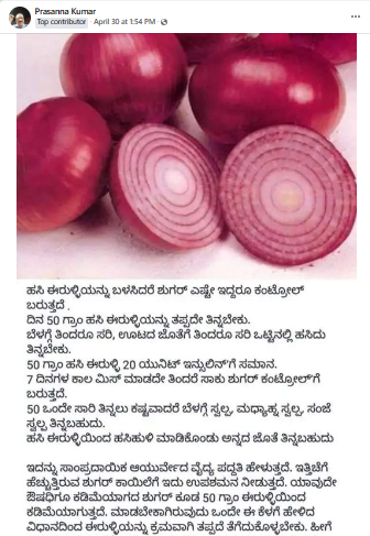 ಫೇಸ್ಬುಕ್ನಲ್ಲಿ ಕಂಡುಬಂದ ಈ ಕ್ಲೇಮಿನ ಪ್ರಕಾರ, “ ಹಸಿ ಈರುಳ್ಳಿಯನ್ನು ಬಳಸಿದರೆ, ಶುಗರ್ ಎಷ್ಟೇ ಇದ್ದರೂ ಕಂಟ್ರೋಲ್ಗೆ ಬರುತ್ತದೆ. ದಿನ 50 ಗ್ರಾಂ ಹಸಿ ಈರುಳ್ಳಿಯನ್ನು ತಿನ್ನಬೇಕು. 50 ಗ್ರಾಂ ಈರುಳ್ಳಿ 20 ಯುನಿಟ್ ಇನ್ಸುಲಿನ್ಗೆ ಸಮಾನ” ಎಂದು ಹೇಳಲಾಗಿದೆ.