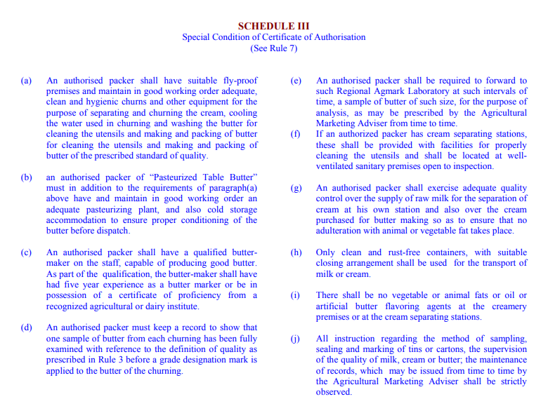 ಇದರೊಂದಿಗೆ ಉತ್ಪನ್ನವೊಂದು ಎಜಿಮಾರ್ಕ್ ಅನ್ನು ಹೊಂದಿರಬೇಕಾದರೆ ಹೊಂದಿರಬೇಕಾದ ಅರ್ಹತೆ ಬಗ್ಗೆ 3ನೇ ಶೆಡ್ಯೂಲ್ನ 7ನೇ ನಿಯಮದಲ್ಲಿ ಹೇಳಲಾಗಿದೆ. ಒಟ್ಟು 10 ನಿಯಮಗಳು ಇದರಲ್ಲಿದ್ದು ಇವುಗಳನ್ನು ಪೂರೈಸಿದರೆ ಮಾತ್ರ ಉತ್ಪನ್ನಕ್ಕೆ ಎಜಿಮಾರ್ಕ್ ಲಭ್ಯವಾಗುತ್ತದೆ.