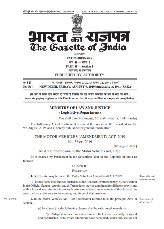 The Gazette notification on ‘THE MOTOR VEHICLES (AMENDMENT) ACT, 2019’: Dated 9th August 2019