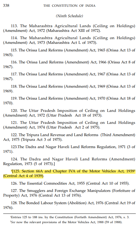 1939ರ ಮೋಟಾರು ವಾಹನ ಕಾಯ್ದೆಯನ್ನು ಸಂವಿಧಾನದ 9ನೇ ಪರಿಚ್ಛೇದಕ್ಕೆ ಸೇರಿಸಲಾಗಿದ್ದು, ಈ ಕಾಯ್ದೆಯನ್ನು ಬದಲಾಯಿಸುವ, ಹಿಂತೆಗೆಯುವ ಶಾಸನಬದ್ಧ ಹಕ್ಕು ಶಾಸನ ಸಭೆಯಾದ ಸಂಸತ್ತಿಗೆ ಮಾತ್ರವೇ ಇರುತ್ತದೆ.