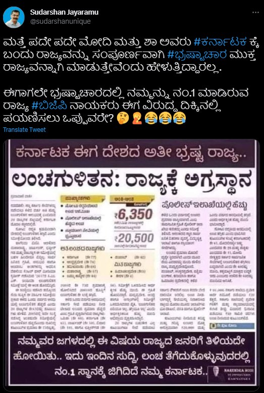 ಈ ಕುರಿತು ಟ್ವಿಟರ್ನಲ್ಲಿ ಪೋಸ್ಟ್ ಮಾಡಲಾದ ಕ್ಲೇಮ್ ಒಂದರಲ್ಲಿ. “ಮತ್ತೆ ಪದೇ ಪದೇ ಮೋದಿ ಮತ್ತು ಶಾ ಅವರು #ಕರ್ನಾಟಕ ಕ್ಕೆ ಬಂದು ರಾಜ್ಯವನ್ನು ಸಂಪೂರ್ಣವಾಗಿ #ಭ್ರಷ್ಟಾಚಾರ ಮುಕ್ತ ರಾಜ್ಯವನ್ನಾಗಿ ಮಾಡುತ್ತೇವೆಂದು ಹೇಳುತ್ತಿದ್ದಾರಲ್ಲ. ಈಗಾಗಲೇ ಭ್ರಷ್ಟಾಚಾರದಲ್ಲಿ ನಮ್ಮನ್ನು ನಂ.1 ಮಾಡಿರುವ ರಾಜ್ಯ #ಬಿಜೆಪಿ ನಾಯಕರು ಈಗ ವಿರುದ್ಧ ದಿಕ್ಕಿನಲ್ಲಿ ಪಯಣಿಸಲು ಒಪ್ಪುವರೇ?” ಎಂದು ಬರೆಯಲಾಗಿದೆ. ಇದರ ಜೊತೆಗೆ ಲಂಚಗುಳಿತನ ರಾಜ್ಯಕ್ಕೆ ಅಗ್ರಸ್ಥಾನ ಎಂದು ಪೇಪರ್ ಕಟ್ಟಿಂಗ್ ಒಂದನ್ನು ಲಗತ್ತಿಸಲಾಗಿದೆ. ಈ ಪೋಸ್ಟ್ ಇಲ್ಲಿದೆ.