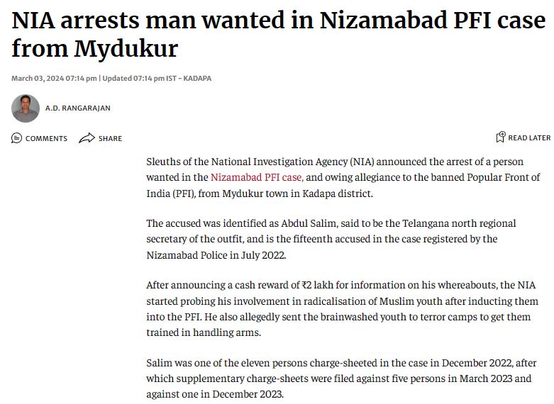 ಮಾರ್ಚ್ 3, 2024ರ ದಿ ಹಿಂದೂ ವರದಿ ಪ್ರಕಾರ “ನಿಜಾಮಾಬಾದ್ ಪಿಎಫ್ಐ ಪ್ರಕರಣಕ್ಕೆ ಸಂಬಂಧಿಸದಿಂತೆ ಎನ್ಐಎ ಮೈದುಕುರ್ ನಿಂದ ವ್ಯಕ್ತಿಯನ್ನು ಬಂಧಿಸಿದೆ. ಬಂಧಿತದನನ್ನು ಅಬ್ದುಲ್ ಸಲೀಂ ಎಂದು ಗುರುತಿಸಲಾಗಿದ್ದು ಈತ ತೆಲಂಗಾಣ ಉತ್ತರದ ಕಾರ್ಯದರ್ಶಿಯಾಗಿದ್ದ” ಎಂದಿದೆ.