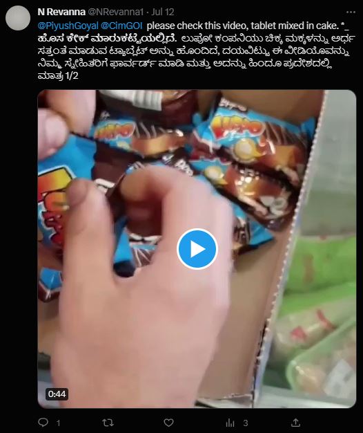 ಹೊಸ ಕೇಕ್ ಮಾರುಕಟ್ಟೆಗೆ ಬಂದಿದ್ದು, ಅದರಲ್ಲಿ ಮಕ್ಕಳ ಆರೋಗ್ಯದ ಮೇಲೆ ಹಾನಿ ಮಾಡುವಂತೆ ಮಾತ್ರೆಗಳನ್ನು ಇಟ್ಟು ಮಾರಾಟ ಮಾಡಲಾಗುತ್ತಿದೆ ಎಂಬ ಹೇಳಿಕೆಯೊಂದು ಸಾಮಾಜಿಕ ಜಾಲತಾಣದಲ್ಲಿ ಹರಿದಾಡಿದೆ.