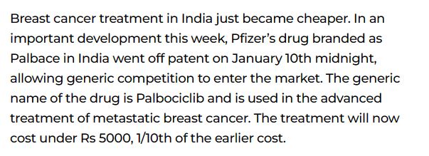 ಜುಲೈ 6, 2023ರ ದಿ ಟ್ರಿಬ್ಯೂನ್ ವರದಿಯ ಪ್ರಕಾರ, “ಸ್ತನ ಕ್ಯಾನ್ಸರ್ನ ಪ್ರಮುಖ ಔಷಧ ಪಾಲ್ಬೋಸಿಕ್ಲಿಬ್ನ ಪೇಟೆಂಟ್ ಅವಧಿಯು ಮುಗಿದಿದ್ದು, ಜೆನೆರಿಕ್ ಆವೃತ್ತಿಗಳಿಗೆ ಅವಕಾಶವಿದೆ ಎಂದು ಸರ್ಕಾರ ಸಂಸತ್ತಿಗೆ ತಿಳಿಸಿದೆ” ಎಂದು ವರದಿ ಮಾಡಿದೆ. “ಬ್ರ್ಯಾಂಡೆಡ್ ಪಾಲ್ಬೋಸಿಕ್ಲಿಬ್ ಔಷಧದ ಬೆಲೆ ₹80 ಸಾವಿರ ಮೇಲ್ಪಟ್ಟು ಇದ್ದು, ಜೆನೆರಿಕ್ ಔಷಧಗಳು ಇನ್ನು ಮಾಸಿಕ ₹3800 ಗಳಲ್ಲಿ ಸಿಗಲಿವೆ” ಎಂದಿದೆ.