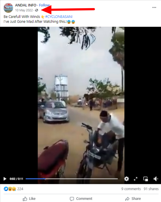 ಮೇ 10, 2022 ರಂದು @ANDALINFO ಎಂಬ ಮತ್ತೊಂದು ಫೇಸ್ಬುಕ್ ಖಾತೆಯಿಂದ ಪೋಸ್ಟ್ ವೈರಲ್ ಕ್ಲಿಪ್ ಅನ್ನು ಅಸಾನಿ ಚಂಡಮಾರುತಕ್ಕೆ ಲಿಂಕ್ ಮಾಡಲಾಗಿತ್ತು.