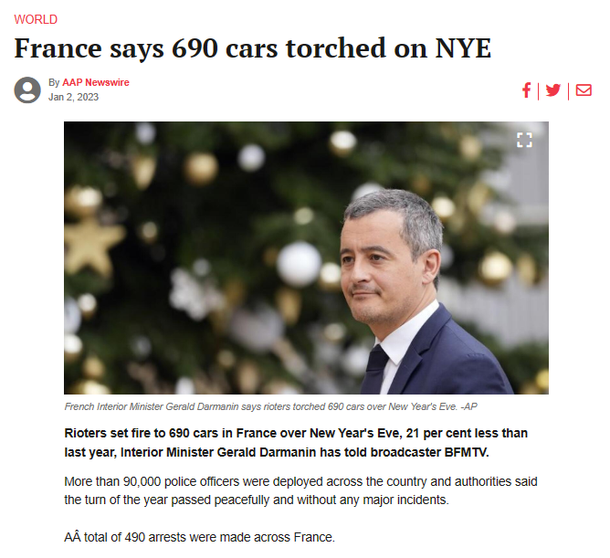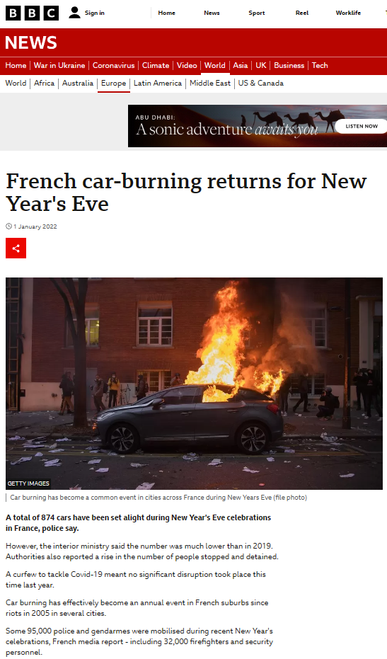 ಜನವರಿ 1 2022ರ ವರದಿಯಲ್ಲೂ ಬಿಬಿಸಿ ನ್ಯೂಸ್ ಕಾರಿಗೆ ಬೆಂಕಿ ಇಕ್ಕುವ ಪ್ರಕರಣದ ಬಗ್ಗೆ ವರದಿ ಮಾಡಿದೆ. 2019ರ ಸಮಯಕ್ಕಿಂತ ಪ್ರಕರಣಗಳ ಸಂಖ್ಯೆ ಕಡಿಮೆಯಾಗಿದೆ ಎಂದು ಫ್ರಾನ್ಸ್ ಆಂತರಿಕ ಸಚಿವಾಲಯ ಹೇಳಿದ್ದನ್ನು ಅದು ಉಲ್ಲೇಖಿಸಿದೆ.