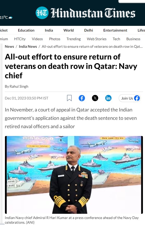 ತನಿಖೆಯ ಸಮಯದಲ್ಲಿ, ಡಿಸೆಂಬರ್ 1, 2023 ರಂದು ಹಿಂದೂಸ್ತಾನ್ ಟೈಮ್ಸ್ ವೆಬ್ಸೈಟ್ನಲ್ಲಿ ಪ್ರಕಟವಾದ ವರದಿಯನ್ನು ನಾವು ಕಂಡುಕೊಂಡಿದ್ದೇವೆ. ಇದು ಭಾರತೀಯ ನೌಕಾಪಡೆಯ ಮುಖ್ಯಸ್ಥ ಅಡ್ಮಿರಲ್ ಆರ್ ಹರಿ ಅವರ ಹೇಳಿಕೆಯನ್ನು ವರದಿ ಒಳಗೊಂಡಿದೆ. “ಕತಾರ್ನಲ್ಲಿರುವ ಎಲ್ಲಾ ಮಾಜಿ ನೌಕಾ ಅಧಿಕಾರಿಗಳು ಬಹಳ ಅನುಭವಿಗಳು. ಅವರೆಲ್ಲರ ವಾಪಸಾತಿಯನ್ನು ಖಚಿತಪಡಿಸಿಕೊಳ್ಳಲು ಭಾರತ ಸರ್ಕಾರವು ಎಲ್ಲಾ ಪ್ರಯತ್ನಗಳನ್ನು ಮಾಡುತ್ತಿದೆ” ಎಂದು ಅವರು ಹೇಳಿದರು.