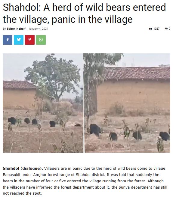 ಜನವರಿ 4, 2024ರ ಇಟಿವಿ ಮಧ್ಯಪ್ರದೇಶ ವರದಿಯಲ್ಲಿ “ಮಧ್ಯಪ್ರದೇಶದ ಶಾಧೋಲ್ ಅರಣ್ಯದಿಂದ ಆವೃತವಾಗಿರುವ ಜಿಲ್ಲೆಯಾಗಿದ್ದು ಇಲ್ಲಿನ ಅಮ್ಝೋರ್ ಅರಣ್ಯ ವಲಯದ ಬಾನ್ಸುಕ್ಲಿ ಗ್ರಾಮಕ್ಕೆ ಕರಡಿಗಳ ಹಿಂಡು ಲಗ್ಗೆಹಾಕಿದೆ. ಇಲ್ಲಿನ ಗ್ರಾಮಸ್ಥರು ಅರಣ್ಯದ ಬದಿಯಲ್ಲಿ ಮಾತ್ರ ಕರಡಿಗಳನ್ನು ಕಾಣುತ್ತಿದ್ದು, ಏಕಾಏಕಿ ಗ್ರಾಮಕ್ಕೆ ಹಿಂಡು ಬಂದಿದ್ದರಿಂದ ಗಾಬರಿಗೊಂಡಿದ್ದಾರೆ. ಹಲವು ಕರಡಿಗಳು ಬಂದಿದ್ದರಿಂದ ಗ್ರಾಮಸ್ಥರು ಬೊಬ್ಬೆ ಹಾಕಿ ಅವುಗಳನ್ನು ಓಡಿಸಲು ಯತ್ನಿಸಿದ್ದು, ಕೆಲವು ಓಡಿ ಹೋಗಿವೆ” ಎಂದಿದೆ.