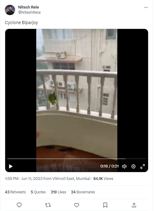 ಬಿಪರ್ ಜಾಯ್ ಚಂಡಮಾರುತದಿಂದಾಗಿ ತೆಂಗಿನ ಮರ ತೀವ್ರವಾಗಿ ತೂಗಾಡುತ್ತಿರುವ ದೃಶ್ಯ ಎಂಬ ವೀಡಿಯೋ ಒಂದು ಸಾಮಾಜಿಕ ಜಾಲತಾಣದಲ್ಲಿ ಸುದ್ದಿ ಮಾಡಿತ್ತು. ಸತ್ಯಶೋಧನೆಯಲ್ಲಿ ಇದು 2022ರ ಘಟನೆ ಮತ್ತು ಮುಂಬೈನಲ್ಲಿ ನಡೆದಿದೆ ಎಂದು ಗೊತ್ತಾಗಿತ್ತು. ಭಾರೀ ಗಾಳಿಯ ರಭಸಕ್ಕೆ ತೆಂಗಿನ ಮರ ತೂಗಾಡಿದೆ ಎಂದು ತಿಳಿದುಬಂದಿದೆ. ಈ ಕುರಿತು ಹೆಚ್ಚಿನದ್ದನ್ನು ಇಲ್ಲಿ ಓದಿ
