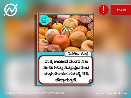 ರಾತ್ರಿ ಊಟದ ನಂತರ ಸಿಹಿತಿಂಡಿಗಳನ್ನು ಸೇವಿಸುವುದು ಅಪಾಯಕಾರಿ ಇದರಿಂದ ಮಧುಮೇಹದ ಸಮಸ್ಯೆ ಹೆಚ್ಚು ಎನ್ನುವ ಹೇಳಿಕೆಯೊಂದು ಸಾಮಾಜಿಕ ಮಾಧ್ಯಮದಲ್ಲಿ ಹರಿದಾಡಿದೆ. ಸತ್ಯಶೋಧನೆಯ ಪ್ರಕಾರ, ಊಟದ ನಂತರ ಸಿಹಿ ತಿಂದರೆ ಮಧುಮೇಹದ ಅಪಾಯ ಹೆಚ್ಚಾಗುವುದು ಪ್ರಿಡಯಾಬಿಟೀಸ್ ಅಥವಾ ಮಧುಮೇಹ ಹೊಂದಿರುವ ವ್ಯಕ್ತಿಗಳಿಗೆ ಮಾತ್ರ ಎಂದು ಗೊತ್ತಾಗಿದೆ. ಈ ಕುರಿತು ಹೆಚ್ಚಿನದ್ದನ್ನು ಇಲ್ಲಿ ಓದಿ