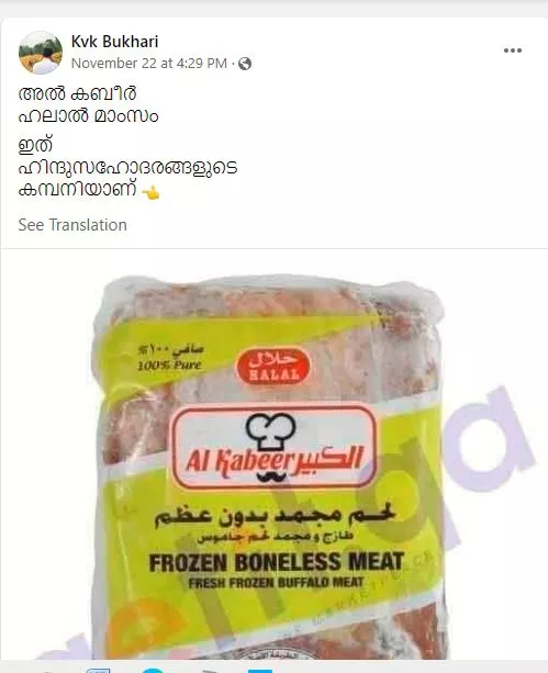 Kvk Bukhariയുടെ പോസ്റ്റിനു ഞങ്ങൾ 6 ഷെയറുകൾ കണ്ടു.Kvk Bukhari പറയുന്നത് “അൽ കബീർ ഹലാൽ മാംസം ഇത് ഹിന്ദുസഹോദരങ്ങളുടെ കമ്പനിയാണ്,”എന്നാണ്.