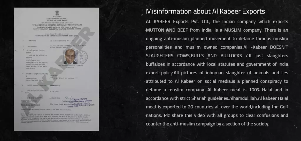 അൽ കബീർ എക്സ്പോർട്സ് എന്ന ഹലാൽ ബീഫ് അടക്കം കയറ്റുമതി ചെയ്യുന്ന സ്ഥാപനം ബിജെപിക്കാരന്റെ കമ്പനിയാണ് എന്നും സംഘപരിവാർ അനുഭാവികളുടെ കമ്പനിയാണ് എന്നും ഹിന്ദു കമ്പനിയാണ് എന്നും വിവിധ തരത്തിലുള്ള പ്രചാരണങ്ങൾ ഫേസ്ബുക്കിൽ നടക്കുന്നുണ്ട്. ഹലാൽ ഭക്ഷണത്തെ കുറിച്ചുള്ള ചർച്ച സമൂഹ മാധ്യമങ്ങളിൽ നടക്കുന്ന സാഹചര്യത്തിലാണ് ഇത്.