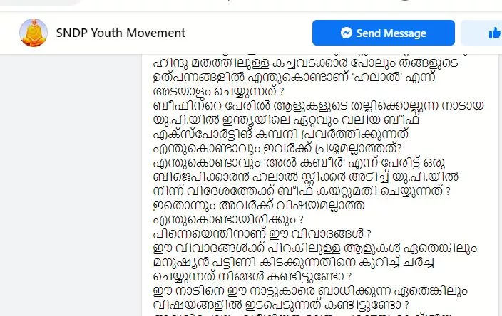 SNDP Youth Movementന്റെ പോസ്റ്റിനു ഞങ്ങൾ നോക്കുമ്പോൾ 1.1k റിയാക്ഷനുകളും 430 ഷെയറുകളും കണ്ടു. “ബീഫിന്റെ പേരിൽ ആളുകളെ തല്ലിക്കൊല്ലുന്ന നാടായ യു.പി.യിൽ ഇന്ത്യയിലെ ഏറ്റവും വലിയ ബീഫ് എക്സ്പോർട്ടിങ് കമ്പനി പ്രവർത്തിക്കുന്നത് എന്തുകൊണ്ടാവും ഇവർക്ക് പ്രശ്നമല്ലാത്തത്? എന്തുകൊണ്ടാവും ‘അൽ കബീർ’ എന്ന് പേരിട്ട് ഒരു ബിജെപിക്കാരൻ ഹലാൽ സ്റ്റിക്കർ അടിച്ച് യു.പി.യിൽ നിന്ന് വിദേശത്തേക്ക് ബീഫ് കയറ്റുമതി ചെയ്യുന്നത്?.” എന്നൊക്കെയാണ് ഈ പോസ്റ്റ് ചോദിക്കുന്നത്.