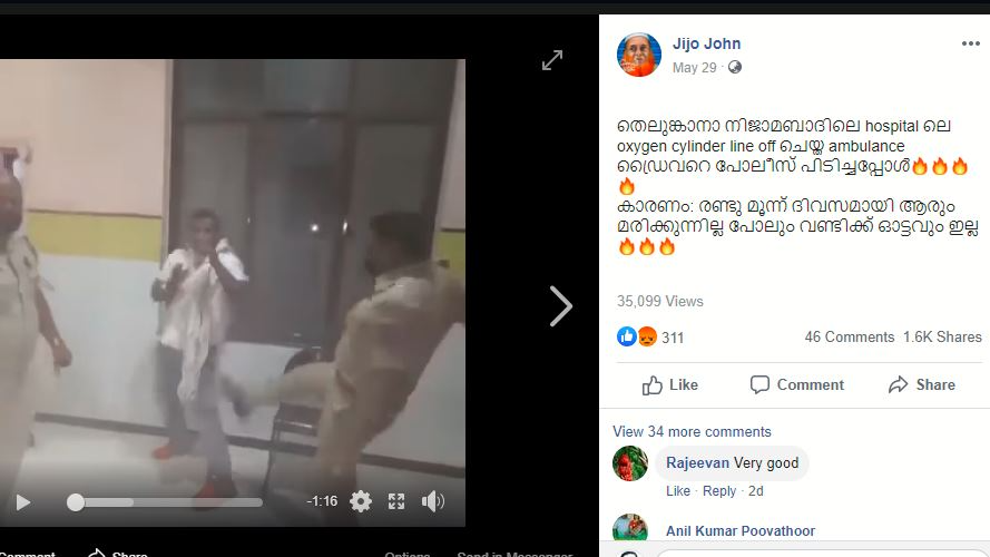 തെലുങ്കാന നിജാമബാദിലെ ആശുപത്രിയിൽ ഓക്സിജൻ സിലിണ്ടർ ലൈൻ ഓഫ് ചെയ്ത ആംബുലൻസ് ഡ്രൈവറെ പോലീസ് പിടിച്ചപ്പോൾ എന്ന് പറഞ്ഞു ഒരു വീഡിയോ പോസ്റ്റ് ഫേസ്ബുക്കിൽ വൈറൽ ആവുന്നുണ്ട്. രണ്ടു മൂന്ന് ദിവസമായി ആരും മരിക്കുന്നില്ല. അത് കൊണ്ട് വണ്ടിയ്ക്ക് ഓട്ടം കിട്ടുന്നില്ല. അത് കൊണ്ടാണ് ഡ്രൈവർ ആ ക്രൂര കൃത്യം ചെയ്യുന്നത് എന്നാണ് വീഡിയോയ്ക്കൊപ്പമുള്ള വിവരണം പറയുന്നത്.ഹോക്സ് വ്യൂ മീഡിയ,24 ടൈം മീഡിയ,ജിജോ ജോൺ എന്നീ ഐഡികൾ എല്ലാം തന്നെ വീഡിയോ ഷെയർ ചെയ്തിട്ടുണ്ട്. മേയ് 29 നു ജിജോ ജോൺ എന്ന ഐഡിയിൽ നിന്നും ഷെയർ ചെയ്ത വീഡിയോയ്ക്ക് ഇതുവരെ 16 k ഷെയറും 35 k വ്യൂവുമുണ്ട്.