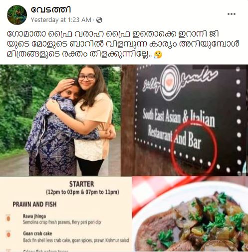 കേന്ദ്രമന്ത്രി സ്മൃതി ഇറാനിയുടെ മകൾ സോയിഷ് ഇറാനി നടത്തുന്നത് എന്ന് ആരോപിക്കപ്പെടുന്ന സില്ലി സോൾസ് കഫേ ആൻഡ് ബാറിൽ ബീഫും പോർക്കും അടങ്ങുന്ന വിഭവങ്ങൾ ലഭിക്കുമെന്ന് കാണിക്കുന്ന മെനു കാർഡിന്റെ ചിത്രം സമൂഹ മാധ്യമങ്ങളിൽ വൈറലാകുന്നുണ്ട്.