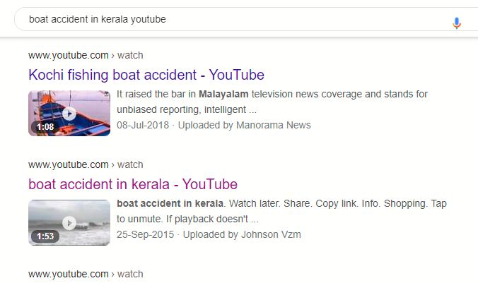 തുടർന്ന് boat accident in kerala youtube എന്ന് സേർച്ച് ചെയ്തപ്പോൾ Johnson Vzm എന്ന ആൾ സെപ്തംബര് 25, 2015ൽ പോസ്റ്റ് ചെയ്ത വീഡിയോ കിട്ടി.