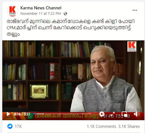 രാജ്ഭവന്റെ സംരക്ഷണത്തിനായി കേന്ദ്ര സേന എന്ന പേരിൽ ഒരു പ്രചരണം ഫേസ്ബുക്കിൽ നടക്കുന്നുണ്ട്. യൂണിഫോമിട്ട ചില ഉദ്യോഗസ്ഥർ രാജ് ഭവന് മുന്നിൽ നില്കുന്ന പടത്തിനൊപ്പമാണ് പോസ്റ്റുകൾ.