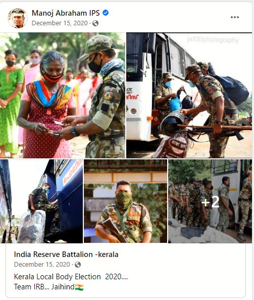 എഡിജിപി മനോജ് എബ്രഹാം 2020 ഡിസംബർ 15ന് ഒരു ഫേസ്ബുക്ക് പോസ്റ്റിൽ ഇന്ത്യന് റിസര്വ് ബെറ്റാലിയന്ന്റെ ചില പ്രവർത്തനങ്ങൾ പങ്ക് വെച്ചിരുന്നു. അതിൽ നിന്നും ഫോട്ടോകളിലേതിന് സമാനമാണ് ഇന്ത്യന് റിസര്വ് ബെറ്റാലിയനിലെ യൂണിഫോം എന്ന് മനസിലായി.