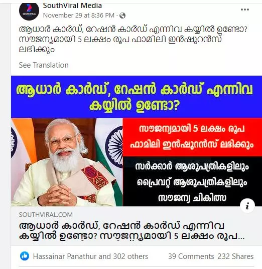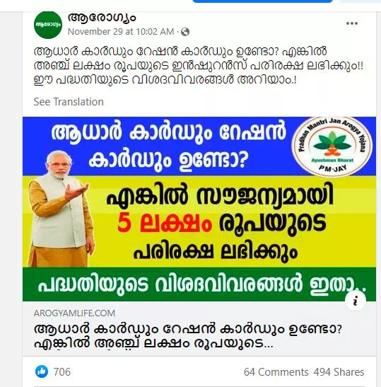 “ആധാർ കാർഡും റേഷൻ കാർഡും ഉണ്ടോ? എങ്കിൽ അഞ്ച് ലക്ഷം രൂപയുടെ ഇൻഷുറൻസ് പരിരക്ഷ ലഭിക്കും,” എന്ന പേരിൽ ഒരു പോസ്റ്റ് ഫേസ്ബുക്കിൽ വൈറലാവുന്നുണ്ട്.