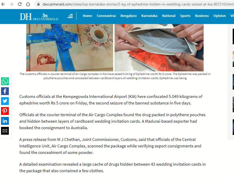 മധുര ആസ്ഥാനമായുള്ള കയറ്റുമതിക്കാരൻ ബുക്ക് ചെയ്ത ഓസ്ട്രേലിയയിലേക്കുള്ള, കാർഡ്ബോർഡ് പെട്ടിയിലെ വിവാഹ ക്ഷണകത്തുകളുടെ പാളികൾക്കിടയിൽ നിന്നാണ് മയക്ക് മരുന്നുകൾ കണ്ടെത്തിയത്,ഡെക്കാൻ ഹെറാൾഡ് റിപ്പോർട്ട് പറയുന്നു.