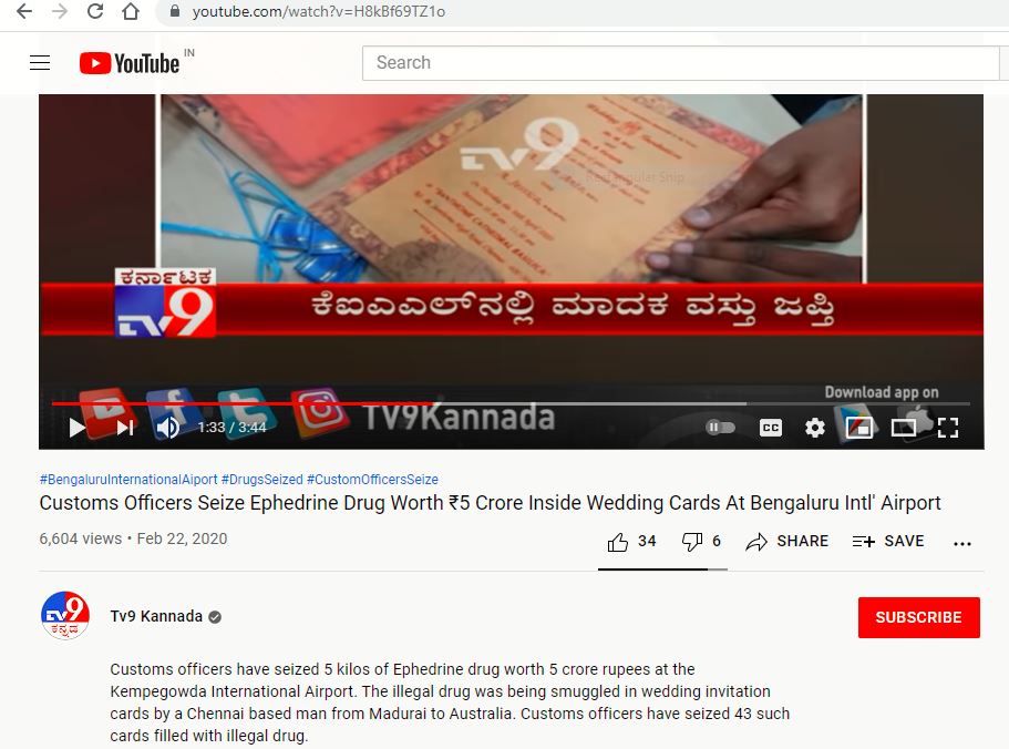 Drugs inside Wedding card എന്ന കീവേഡ് ഉപയോഗിച്ച് ഗൂഗിളിൽ തിരഞ്ഞപ്പോൾ അതേ വീഡിയോയുടെ ഭാഗങ്ങൾ Tv9 Kannadaയുടെ യുട്യൂബ് ചാനലിൽ കണ്ടെത്താനായി.