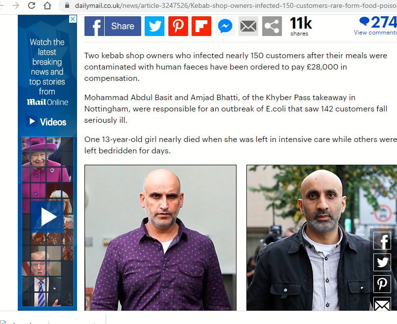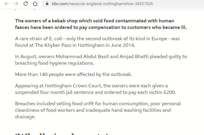 ബിബിസി റിപ്പോർട്ടിലെ ഒരു ഭാഗം ഇങ്ങനെയാണ് : “ഇ-കോളി ബക്ടീരിയയുടെ അപൂർവ ഇനം, 2014 ജൂണിൽ നോട്ടിംഗ്ഹാമിലെ ഖൈബർ പാസ് എന്ന ഭക്ഷണശാലയിൽ നിന്ന് കണ്ടെത്തി. യൂറോപ്പിൽ ഇത്തരത്തിലുള്ള രണ്ടാമത്തെ കേസ് മാത്രം ആണിത്. ഭക്ഷ്യ ശുചിത്വ നിയമങ്ങൾ ലംഘിച്ചു എന്ന കുറ്റം ഉടമകൾ സമ്മതിച്ചു. ഇതു കൊണ്ട് 140-ലധികം ആളുകൾക്ക് പകർച്ചവ്യാധി ബാധിച്ചു. നോട്ടിംഗ്ഹാം ക്രൗൺ കോടതി ഉടമകൾ രണ്ടു പേരെയും നാല് മാസത്തെ ജയിൽ ശിക്ഷയ്ക്ക് വിധിച്ചു. ഈ ശിക്ഷ താത്കാലികമായി കോടതി സസ്പെൻഡ് ചെയ്തിട്ടുണ്ട്. ഓരോ ഇരയ്ക്കും ഉടമകൾ 200 പൗണ്ട് നൽകാനും കോടതി ഉത്തരവിട്ടു.”
